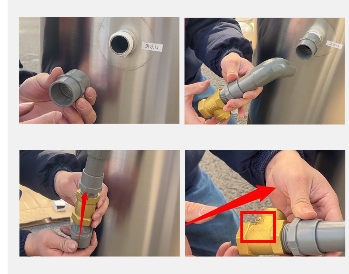 2、出水口接入家里的用水管路:安裝方法和進水口一樣(注意:一定要把生料帶纏平纏均勻,以免出現(xiàn)漏水)