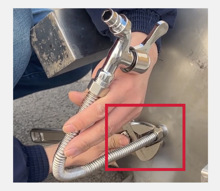 3、安裝排污口:將波紋管兩側藍色蓋帽取下,將波紋管拉直,大概三指距離彎一個直角(注意內(nèi)部密封圈不要掉了),將波紋管安裝到罐體底部的排污口,另一端也要安裝好密封圈,最后將排污水龍頭安裝好。