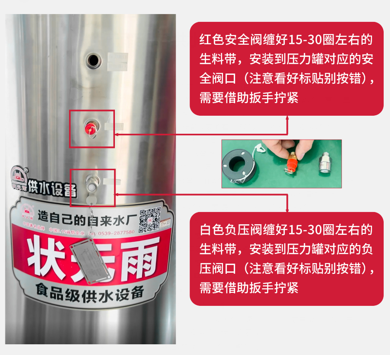 1、紅色安全閥纏好15-30圈左右的生料帶,安裝到壓力罐對應的安全閥口(注意看好標貼別按錯),需要借助扳手擰緊